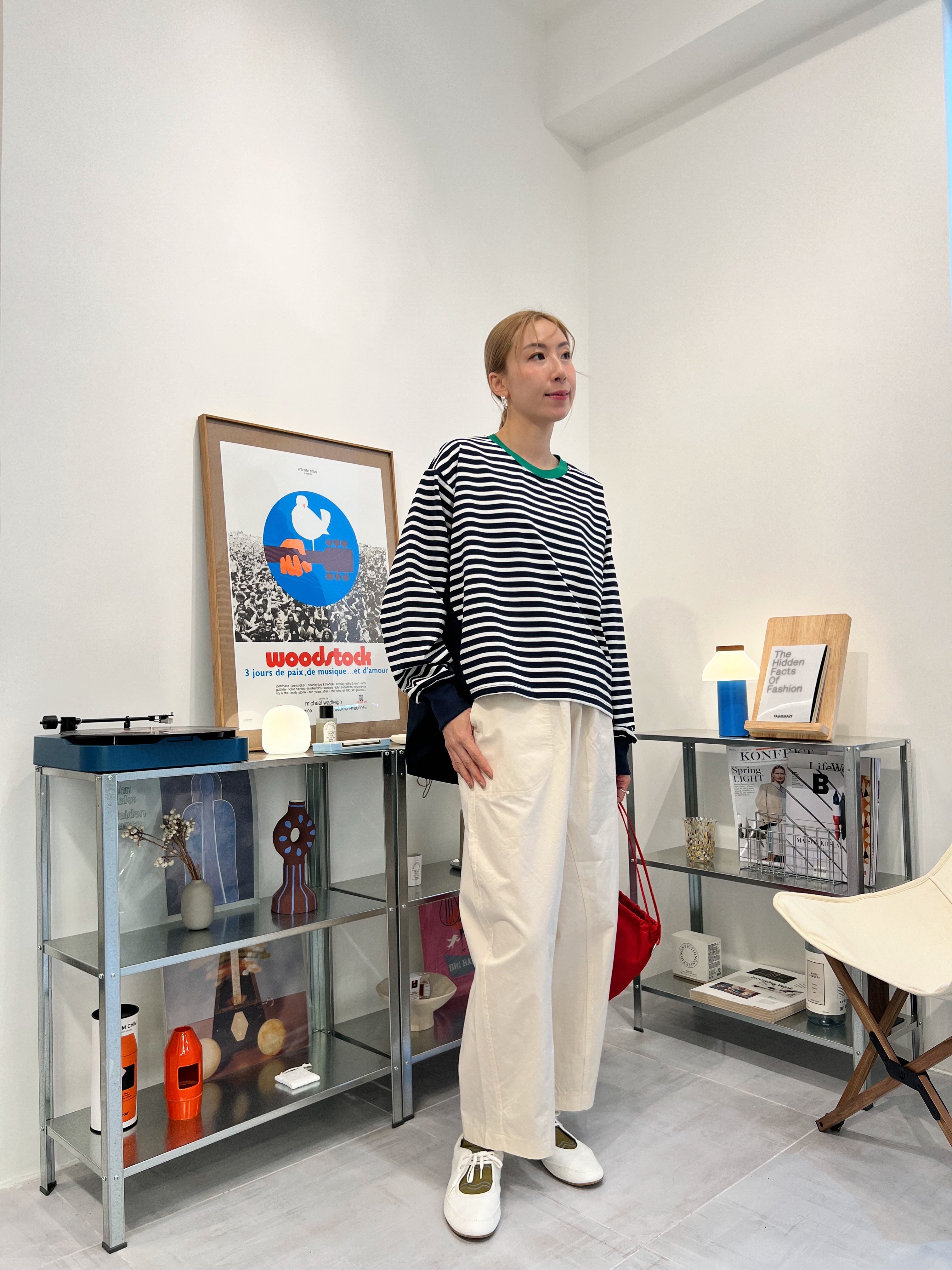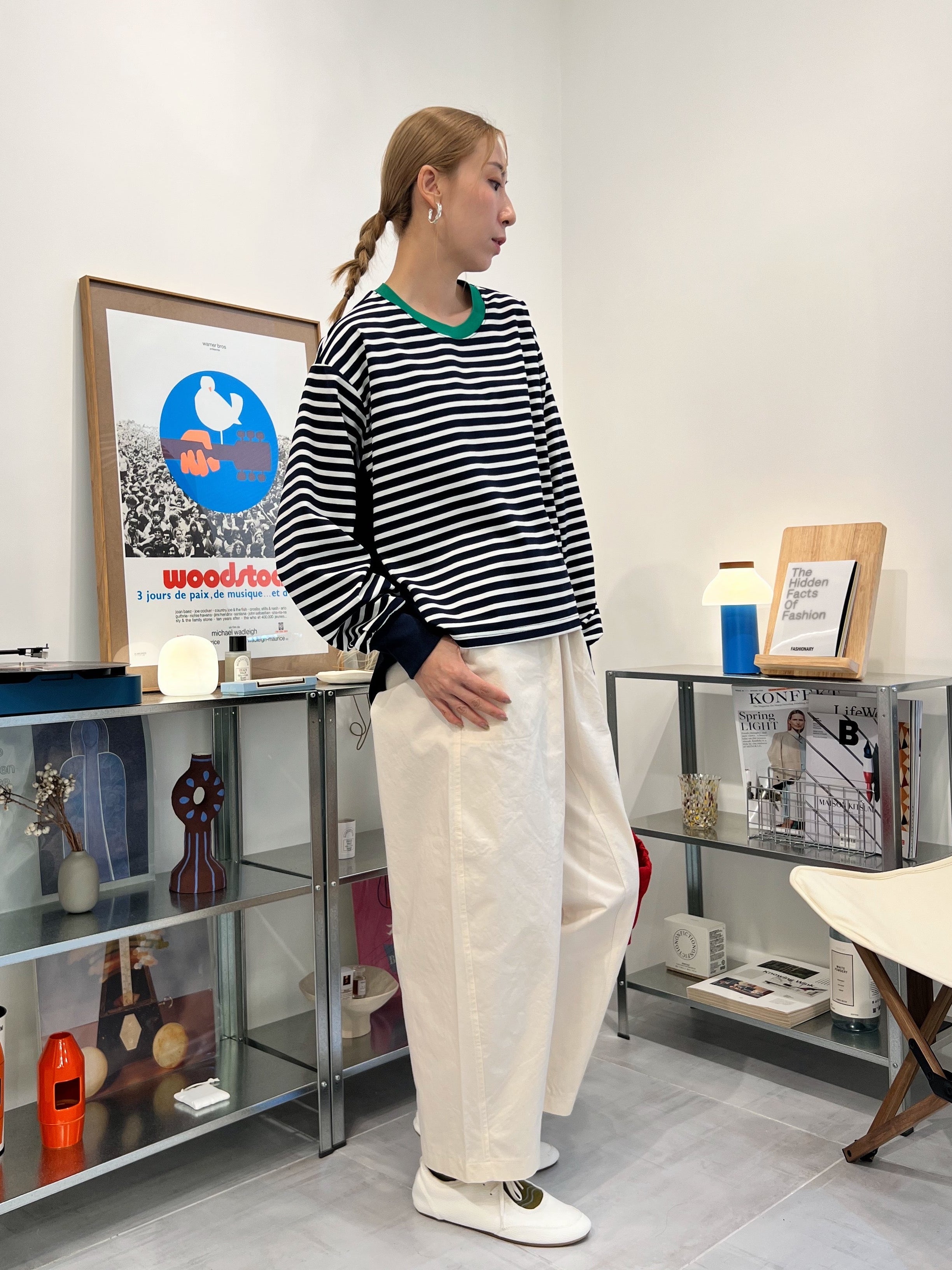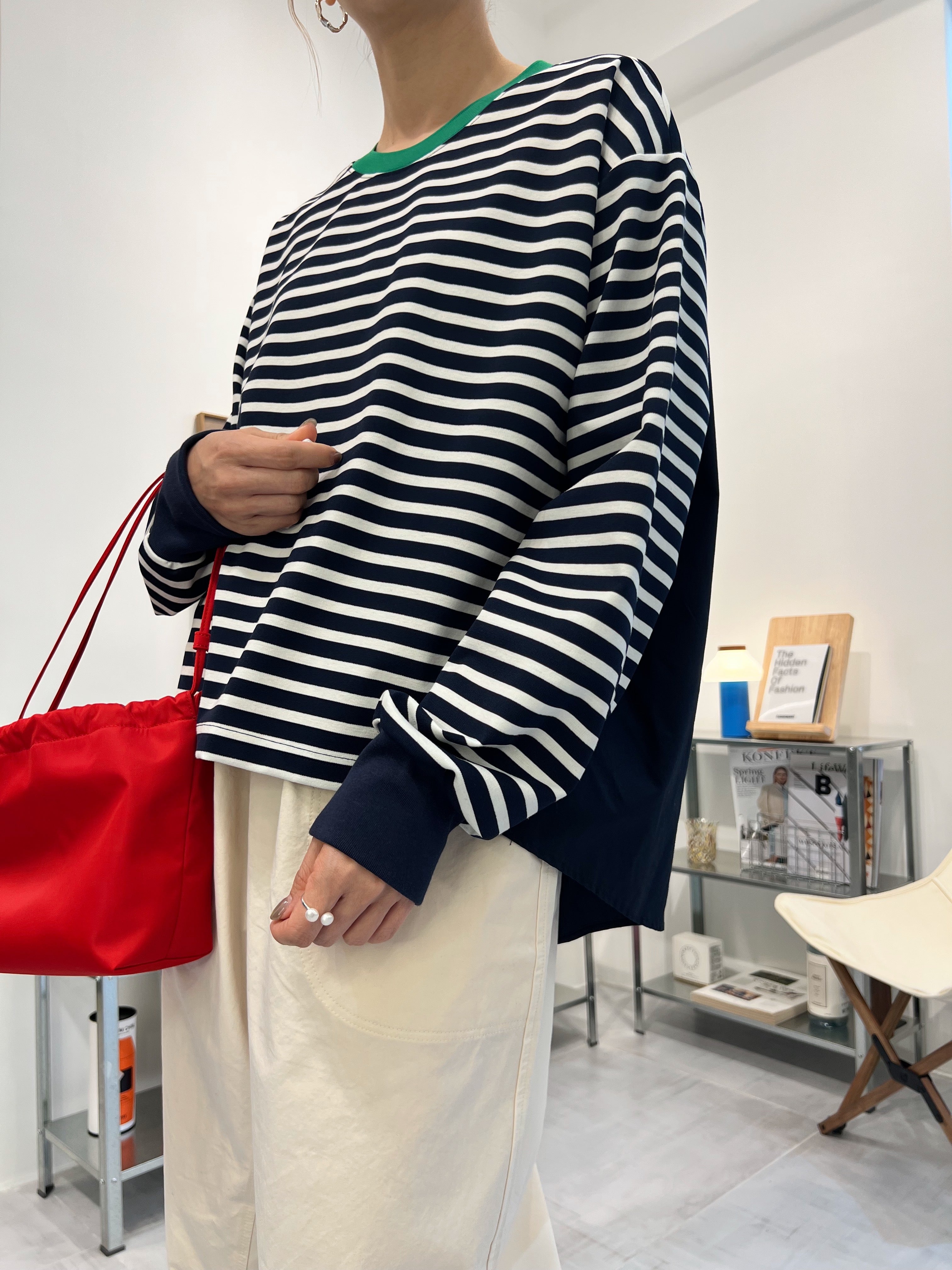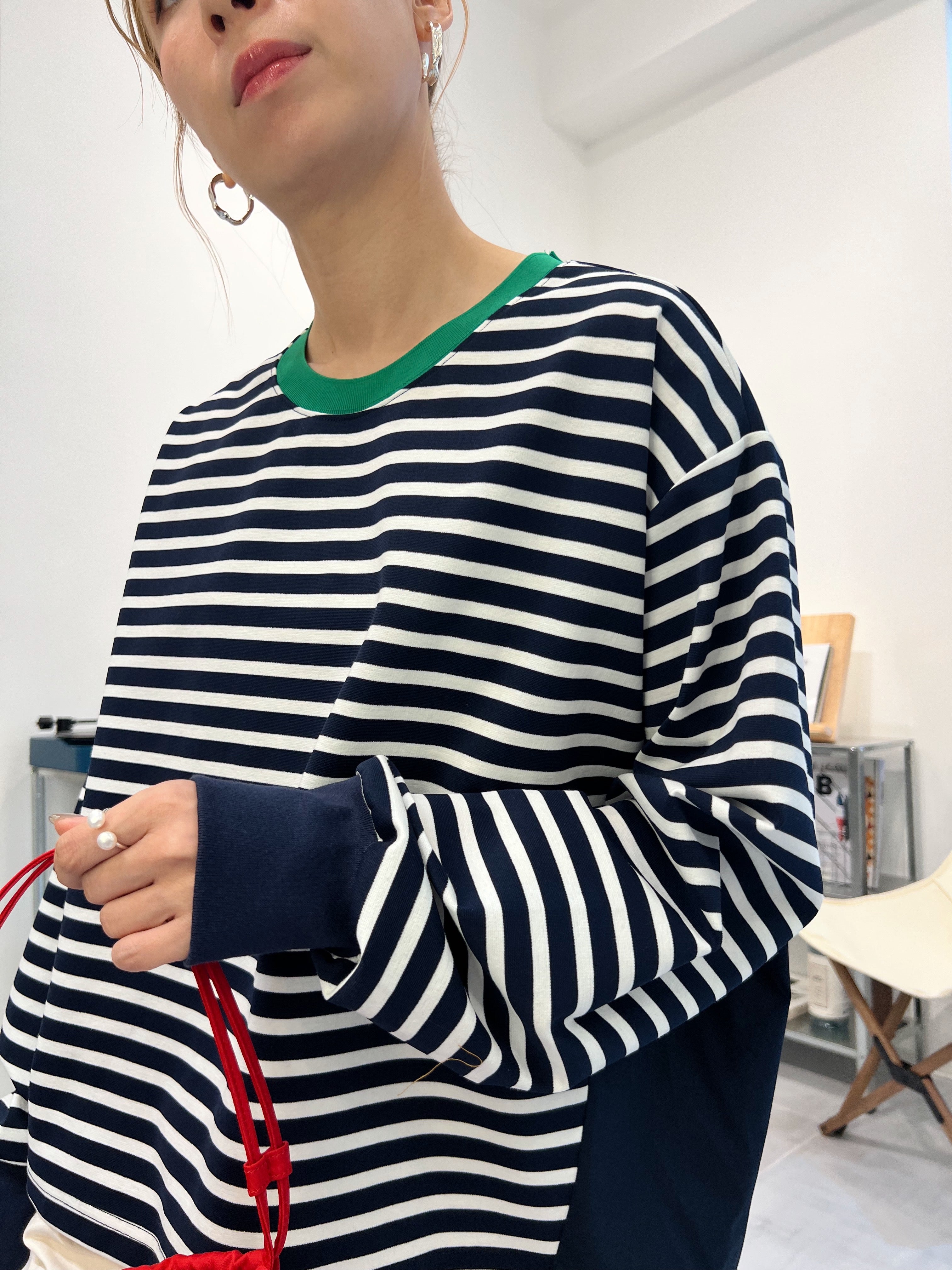 前間條後淨色T-shirt/綠領